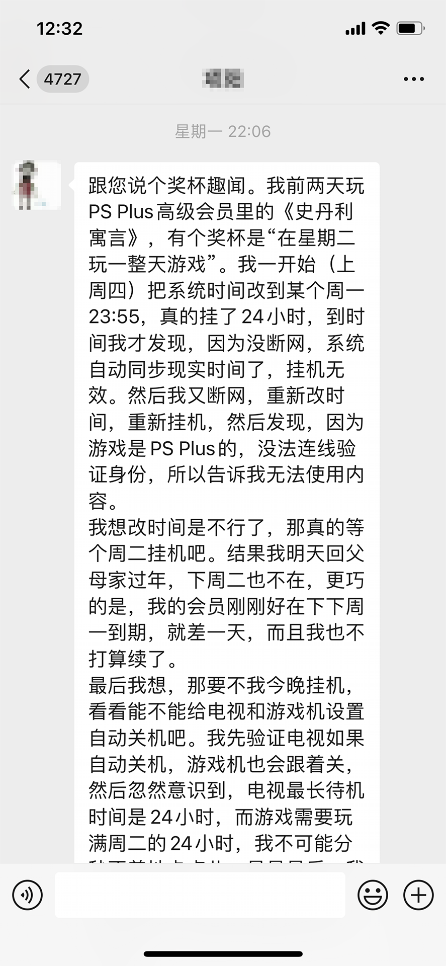 然而杯友面对的局面更为严酷!他的PS会员只剩下本周二最后一天,必须在这个周二,也就是昨天之内把奖杯挂完。又因为他昨天便要出发回老家过年,一去半个月,如果离开时电视和PS5一直开着,将会非常可怕……