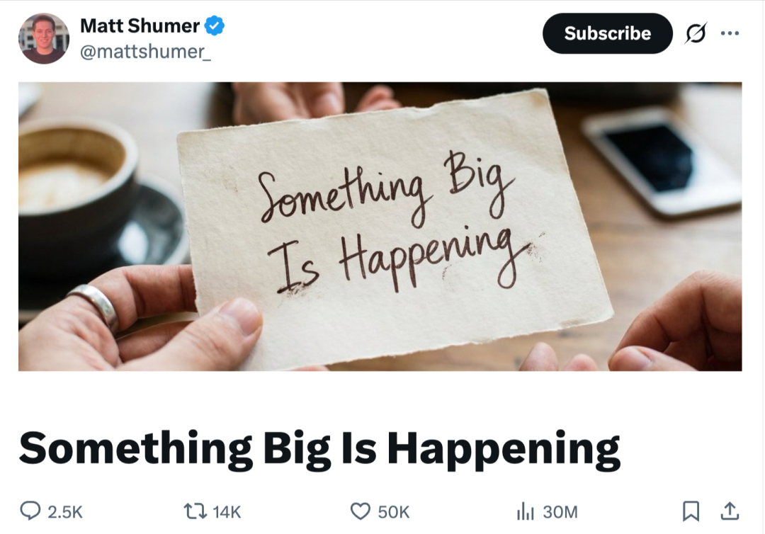 也许正是在这种矛盾和落差之中,今天,一篇雄文《大事正在发生》(Something Big Is Happening)刷爆了推特。不到24小时,阅读量超2000万。作者是一位深耕AI领域的创业者马特·舒默(MattShumer)。