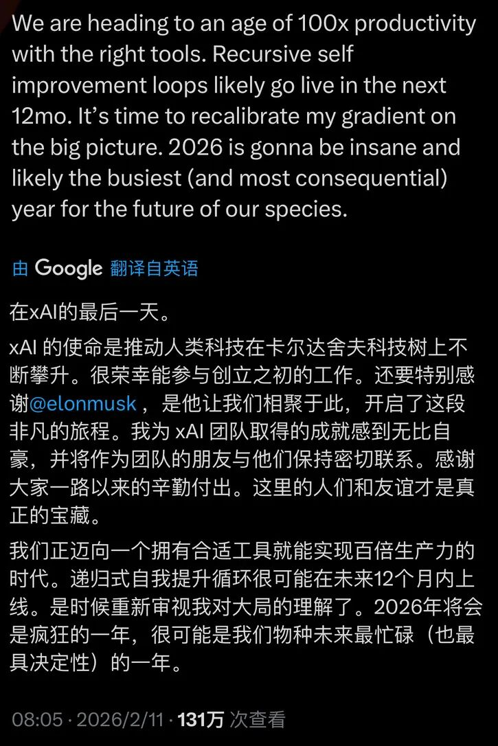 也是同一天,xAI(马斯克的AI公司)的联合创始人Jimmy Ba宣布离职。他在告别帖里写了一段话,不像是在告别,更像是在发出某种信号: