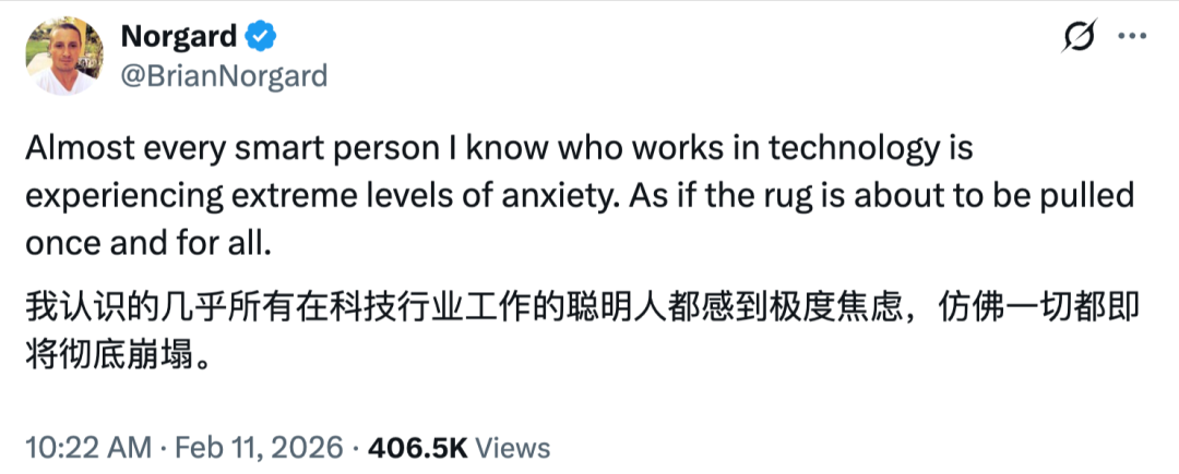 Brian Norgard,硅谷连续创业者,发了一条推文:"我认识的几乎所有在科技行业工作的聪明人,都感到极度焦虑。仿佛一切都即将彻底崩塌。"