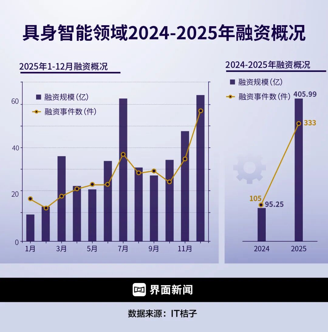 “抛开创业者和项目本身不谈,这个现象本身就说明了时间点上的冰火两重天。”前述投资人说道。IT桔子数据显示,具身智能赛道融资事件数从2024年的105起增加至2025年的333起,融资金额从95.25亿元扩大至405.99亿元,分别激增217%和326%。