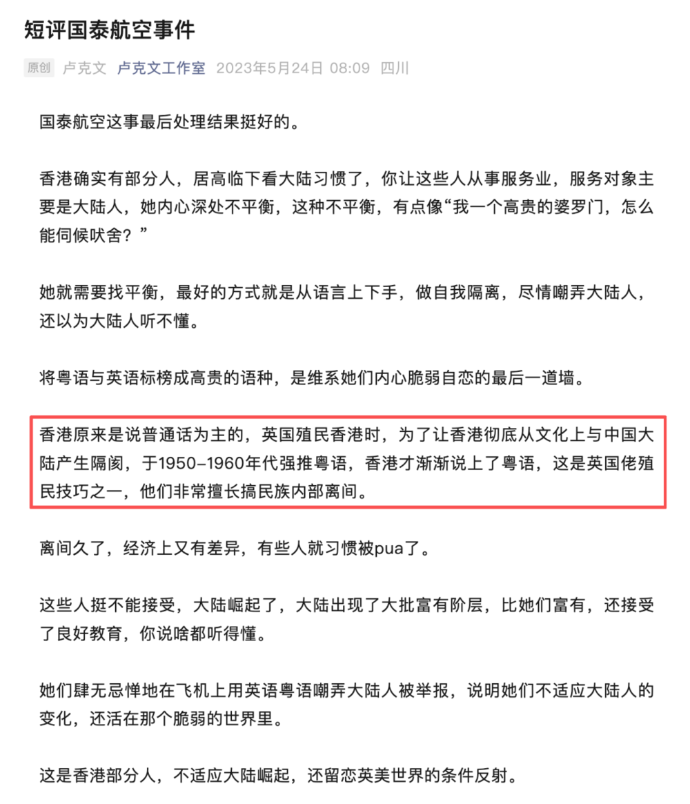 到了2023年,一位在内地网络颇具影响力的博主卢克文,又提出了一个更具冲击力的说法。他声称:香港原本是讲普通话的,只是在英国殖民香港之后,为了切断与祖国大陆的文化联系,才在五六十年代“强推粤语”。