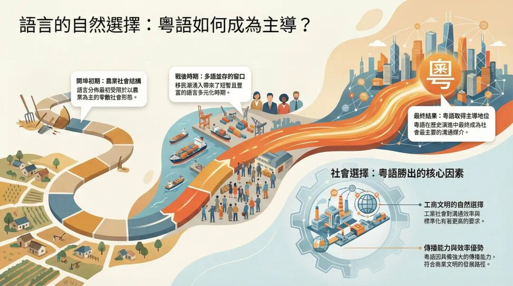 开埠初期的语言分布,源于以农业社会为主的社会结构;战后短暂的多语并存,是移民潮带来的历史窗口;而粤语最终取得主导地位,则是工业社会与商业文明,对效率、标准化与传播能力的自然选择。