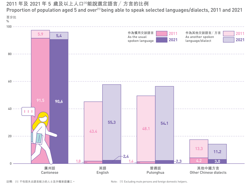 根据香港政府统计处发布的2021年人口普查数据,在全港人口中,约90.6%的人以粤语广州话为惯用语言,如果算上能流利使用广州话的人口,比例更超过95%。相比之下,以英语或普通话为“惯用语言”的比例,分别仅占2.4%和2.3%。