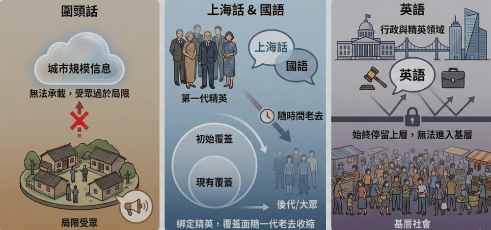 围头话受众过于局限,无法承载城市规模的信息传播;上海话和国语更多绑定精英阶层,随着第一代移民老去,覆盖面不断收缩;而英语,则始终停留在行政与精英领域,无法进入基层社会。