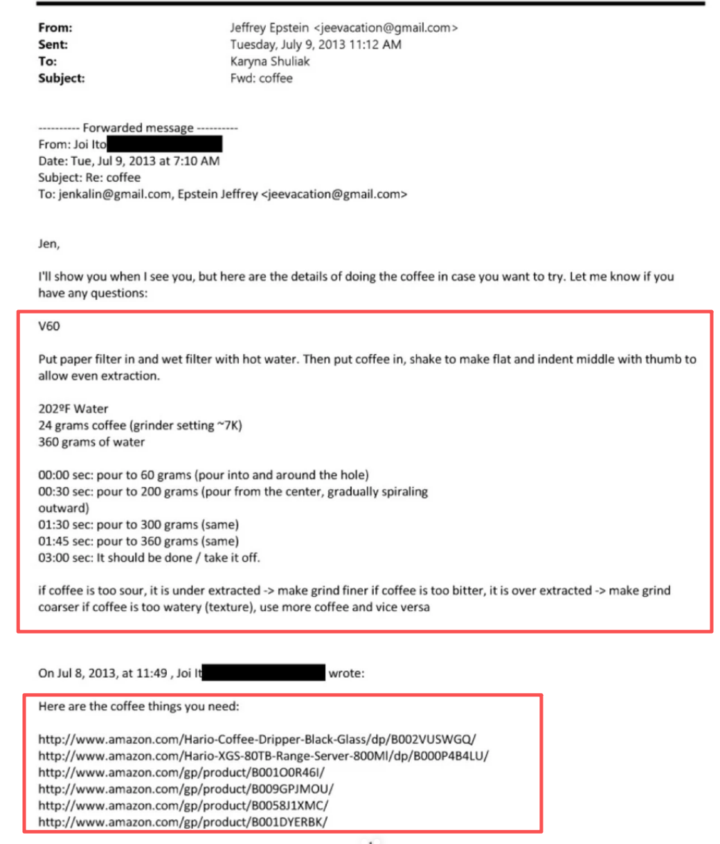 有网友扒出爱泼斯坦手把手指导别人做手冲咖啡,手法、时间、用量等方面都教得极为详细,堪称GPT式详细回答,结尾还附有他推荐的咖啡装备网购地址。