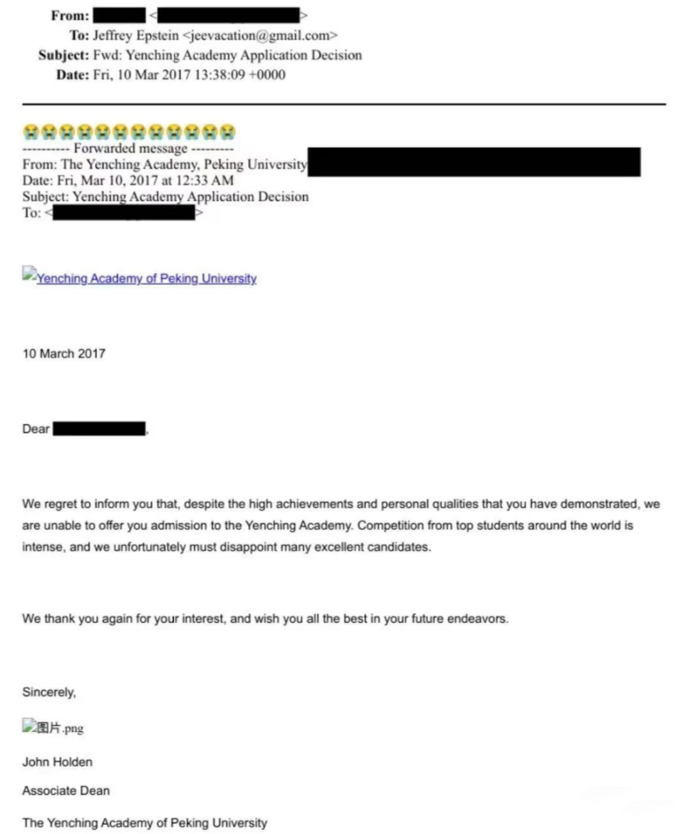 从顶尖企业实习到各种大学入学,每天高强度发邮件,没想到有位服务对象的小孩被北大拒了,跑到爱泼斯坦这里来发大哭emoji,果然还是有他拿不下的地方。