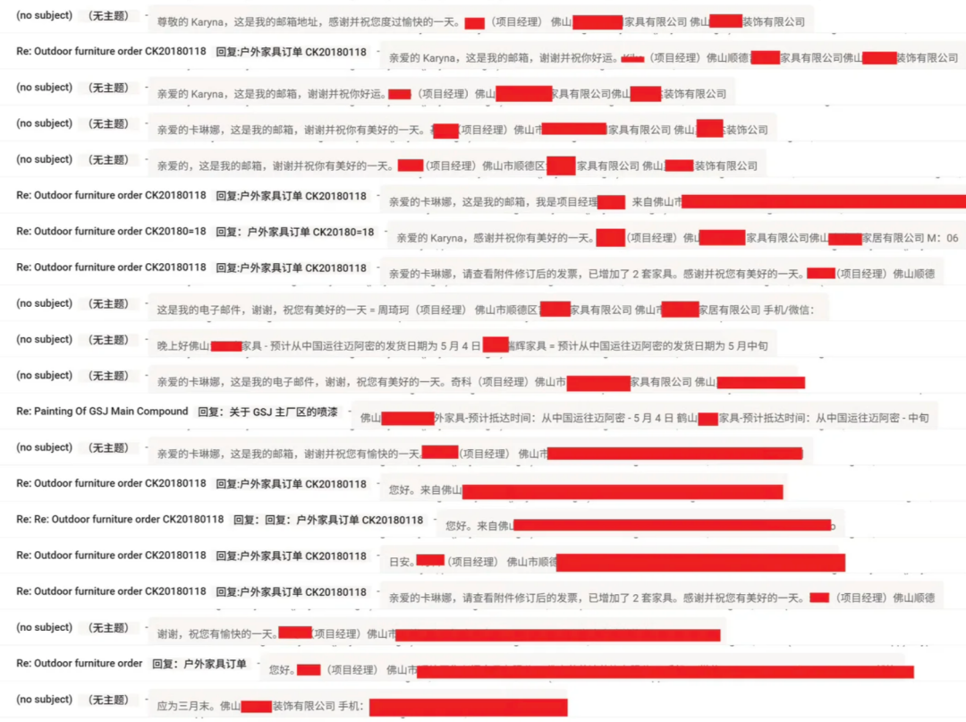 从沟通邮件来看,这些采购涉及了佛山大大小小多家家居装饰公司,订好后直接集装箱装好发往迈阿密。