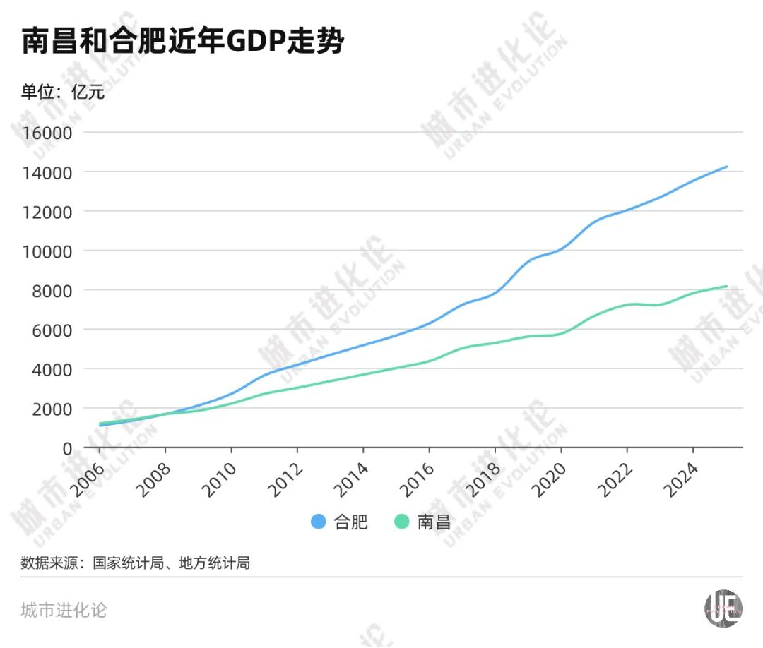 根据国家统计局数据,南昌和合肥在2006年还是一个档次的城市,南昌GDP为1183亿元,合肥为1073亿元,南昌比合肥还高出一截。但到2025年,合肥GDP为14210亿元,经济体量已是南昌的1.75倍。
