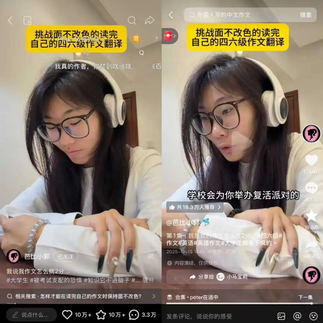 而在抖音,她的受众已突破学生圈层,进入更广泛的泛娱乐人群。这里的观众未必能快速get英语四六级翻译的离谱程度,但能迅速了解她搞笑博主的定位。