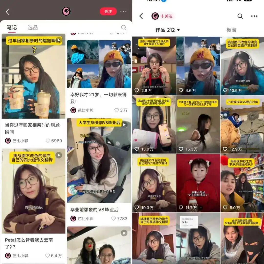 “芭比小郭”小红书和抖音近期发布的内容有所不同