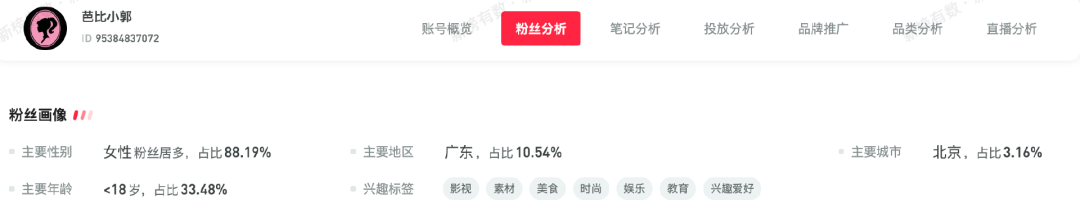 新榜数据显示,其小红书粉丝中女性占比近9成,18岁以下粉丝占比3成,而抖音粉丝中,女性占比6成,31岁-40岁粉丝占比3成。