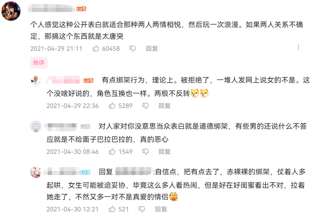 在社交媒体的评论区,当众表白被分为两种情况:两情相悦就祝双方百年好合,一厢情愿那就是众矢之的。