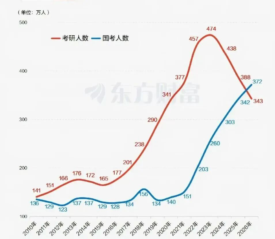 国家公务员考试报名人数约372万,首次超过考研报名人数约343万。
