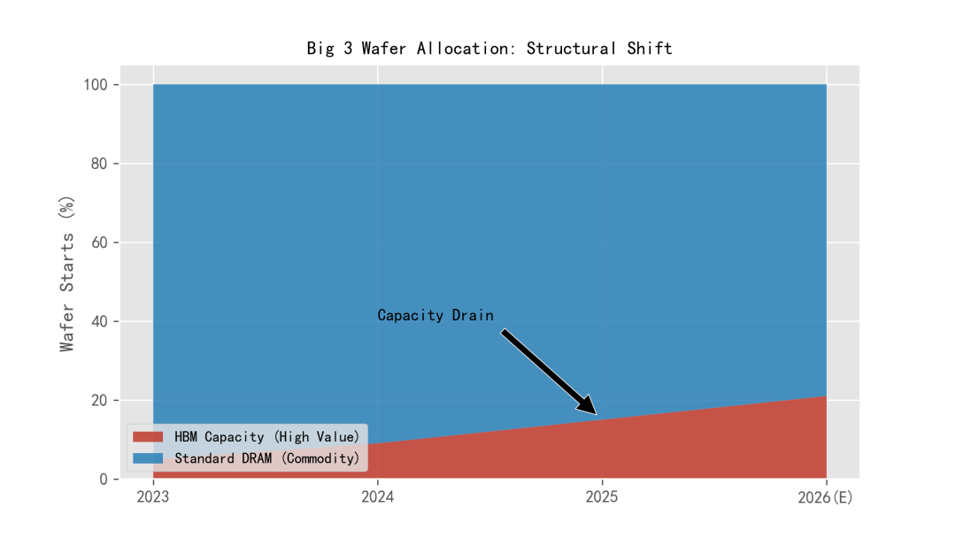 这一技术突破固然稳固了AI算力的供应链,但其对存储产业的深层影响远超技术本身。随着平泽P4等核心产线向HBM4全面倾斜,一场针对全球DRAM产能的“结构性抽血”愈发严重。当我们剥离AI带来的增长光环,看向更广泛的通用存储市场,会发现HBM的产能扩张本质上是一场与通用DRAM(DDR4/DDR5)的零和博弈。