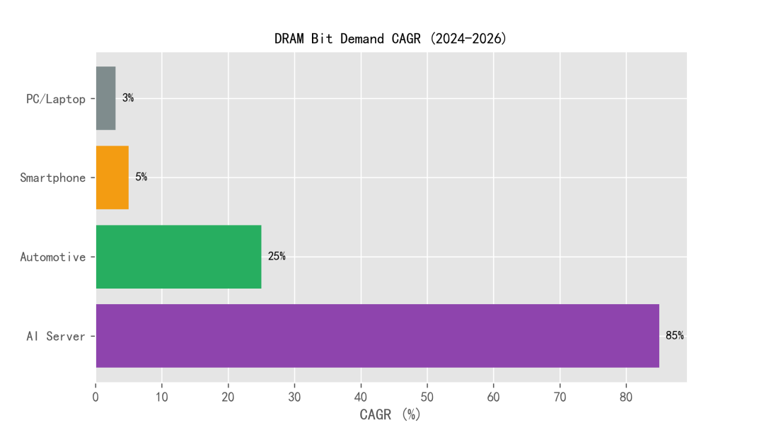 在资本支出有限的前提下,企业的逐利本能决定了其产能分配的优先级。Gartner的数据显示,AI服务器对DRAM的位元消耗年复合增长率(CAGR)高达70%左右,而PC和智能手机仅为3-5%。