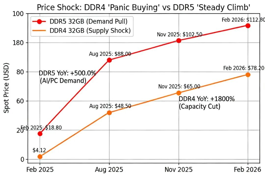 关键洞察:数据不会说谎。虽然DDR5的绝对价格更高,但DDR4的1800%同比涨幅远超DDR5的500%。这意味着,原厂为了HBM而进行的“物理产能抽血”,对成熟制程的冲击甚至大于先进制程。