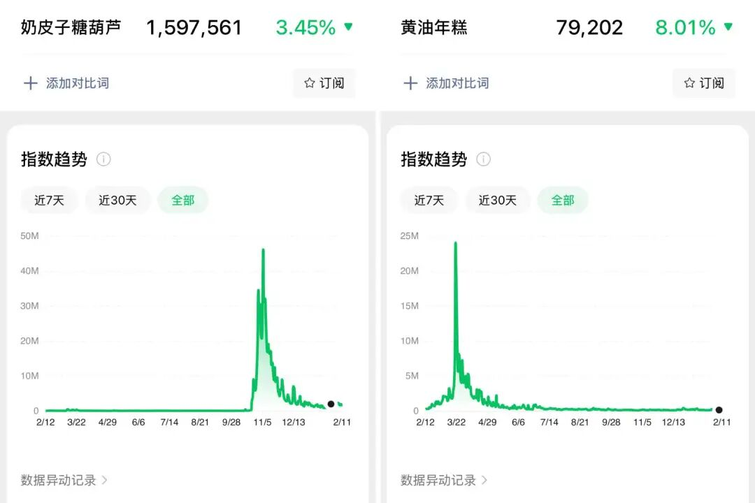 从微信指数来看,奶皮子糖葫芦因季节属性,更适配秋冬场景,目前尚能维持一定的热度;固体杨枝甘露大概维持了一周左右便迅速降温,曾刷屏的黄油年糕热度冲至顶峰后仅半个月,微信指数几乎归零。