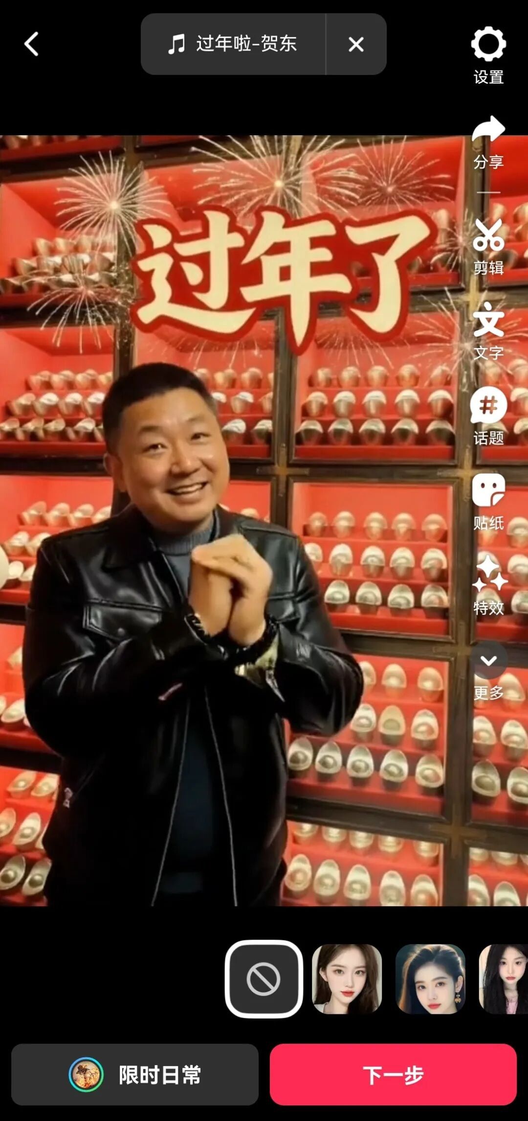 我早已收藏了不少短视频平台上年味十足的AI特效,趁着兴头,选了一张充满年味的生活照,用“拜年手势舞”特效生成了一段短视频。画面中,我身着喜庆卫衣,随着欢快的旋律双手抱拳,躬身作揖。这段视频传到家庭群,爸妈笑得合不拢嘴,连家里的亲戚都纷纷点赞评论:“这拜年仪式感拉满了!”