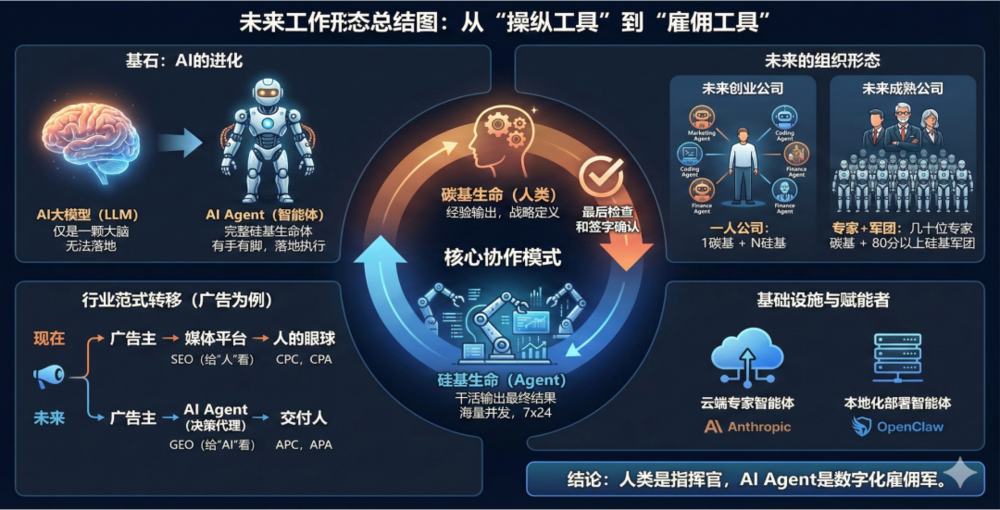 2026年虽然才过去不到两个月,但是AI已经给全球上市的SAAS软件公司上了狠狠的一课。他们被Anthropic、OpenClaw两家美国公司搅动的天翻地覆,特别是美股纯软件公司一天的估值蒸发就超过万亿美金。这两天放假自己在家里也密集的体验了两个公司开发的云端AI agent和本地化AI agent,使用体验可以说非常惊艳!比如我可以预想到的一种改变:比如互联网广告行业:现在广告是给人看的,未来的广告是给AI agent看的,链路会切换成“广告主→AI agent→交付人”;现在大家做的SEO,未来做的一定是GEO;现在平台的模式是CPC/CPM/CPA/CPS等模式,未来应该没有CPM了取而代之的是APC/APA/APS。比如未来创业公司:是一人公司,一个碳基生命带着一群硅基生命一起创业干活!未来成熟公司:是几十个老练的有着丰富洞察力的行业专家型碳基生命带着一群有80分以上的硅基生命干活。试想下未来如果所有AI 应用都能非常成熟的配置到千家万户的时候,那会是怎样的一种效率和新的商业业态,真的是非常期待。