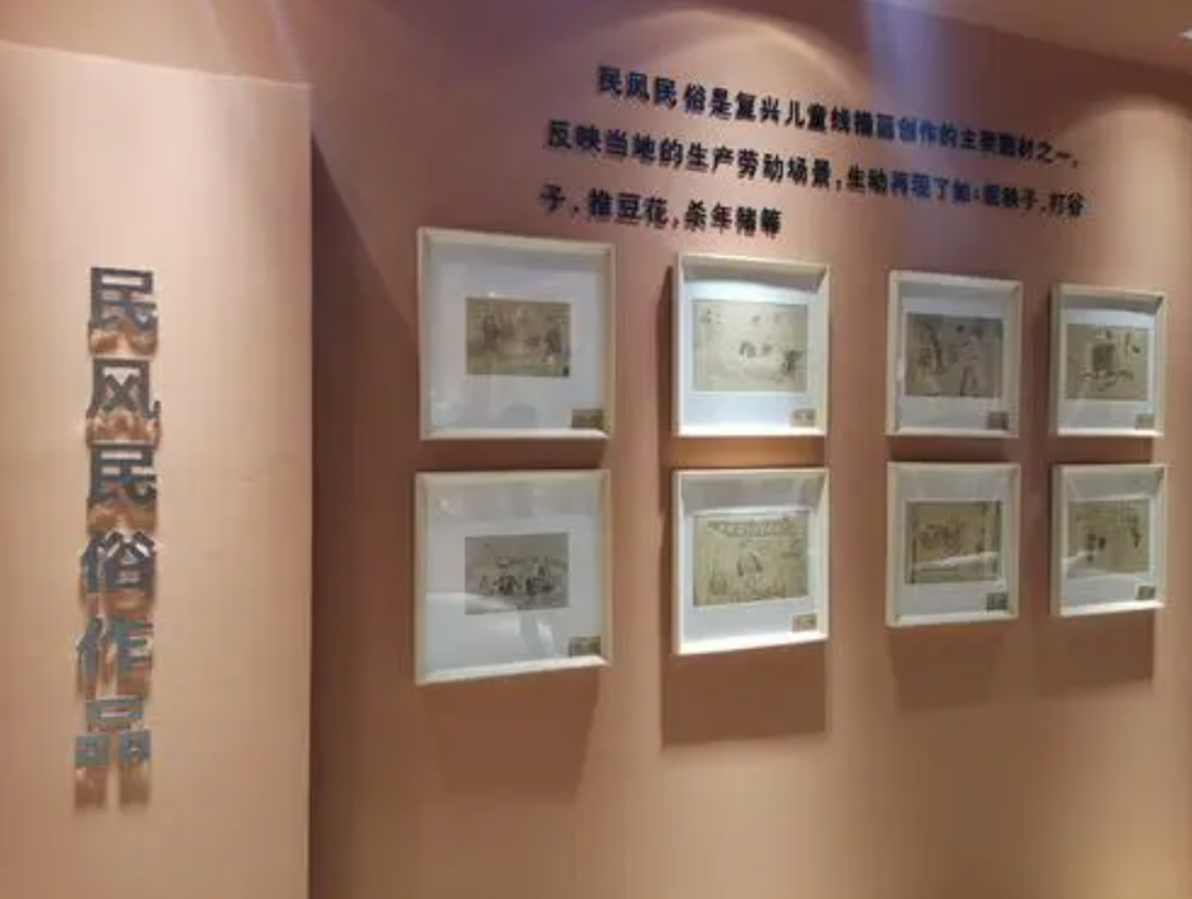 土黄色的墙板上写着几个铜色大字——复兴儿童线描画展览馆,再往里走一些,橙色的墙面上整齐地挂着大大小小的相框,银白色的边框框着的是这些年累积下来的学生作品。每面墙都是一块展览区,旁边或写着“北京奥运会作品”、“上海世博会作品”,又或介绍着复兴儿童线描的香港专展以及欧洲交流的作品。