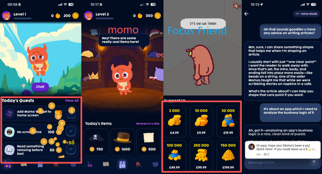 时间来到2025年,无论是像Focus Friend这样,靠创始人“大网红”背景迅速爆火的“编织豆子”;还是像Self-Care Pet:Momo这样,来自异星球、有丰富故事的“八字眉宠物”;驱动专注的核心逻辑都是陪伴与奖励。用户化身“帮助者”,通过专注行为为虚拟角色(豆子、Momo宠物)换取成长资源(编织物换家具、金币换装饰品)。