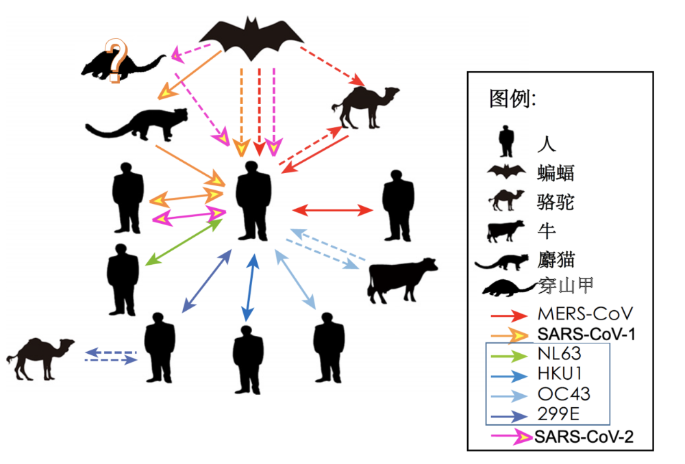 冠状病毒的种内及种间传播:三次冠状病毒爆发均指向蝙蝠这一自然宿主。实线为已证实的传播途径,虚线为疑似传播途径。图源:改编自参考文献[10]