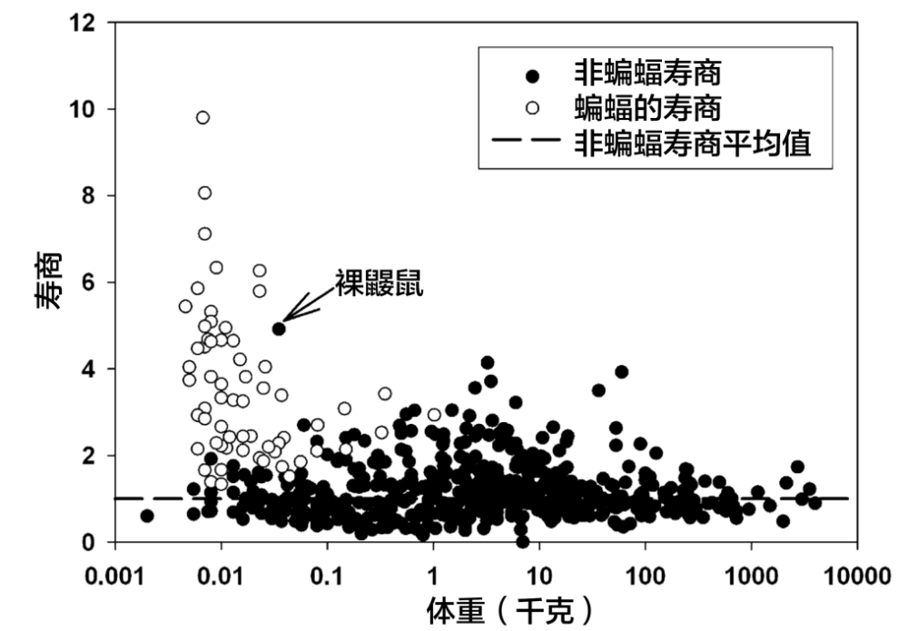 以体型与实验室小鼠差不多的鼠耳蝠为例:实验室小鼠的寿命不超过4年,而鼠耳蝙蝠能活到37岁。据报道,一只于1964年戴上脚环并放归自然的布氏鼠耳蝠,近42年后再次被捕捉到——相当于人类生活了235年[5]。