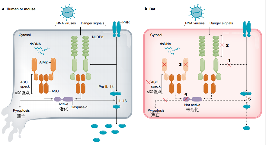 A.在人类或小鼠中,RNA病毒、危险信号或细胞内双链DNA激活NLRP3或AIM2等模式识别受体(PRR),进而激活炎症小体,引发细胞焦亡和IL-1β分泌。B.相比之下,蝙蝠的NLRP3转录启动减弱(1)且功能降低(2),PYHIN(包括AIM2)缺失(3),caspase-1活性降低(4)和/或IL-1β裂解减少(5),从而导致炎症水平总体减轻。图源:参考文献[18]
