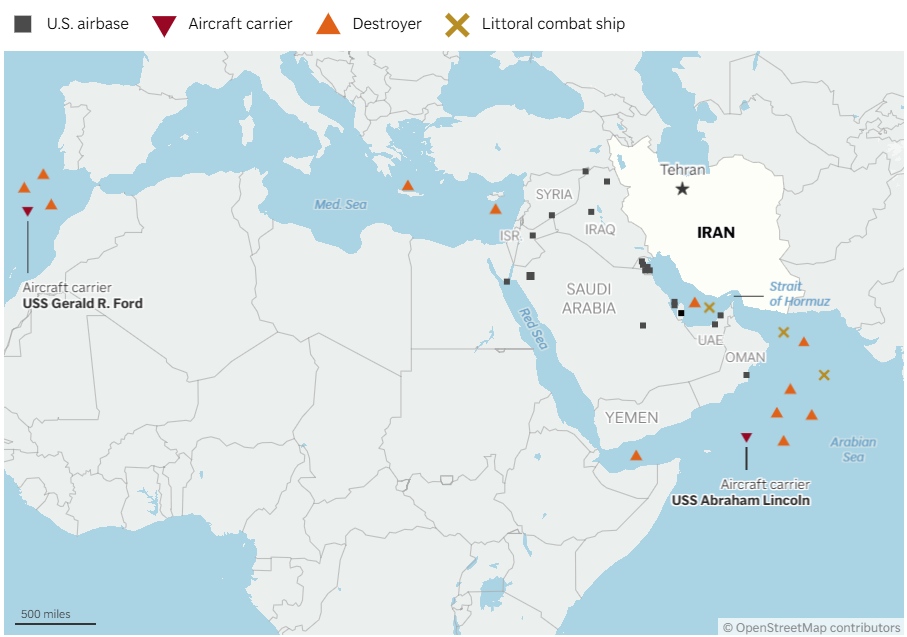 截至2月20日,美军已在中东地区部署林肯号和福特号两个航母战斗群,再加上以色列空军的力量,总兵力已足够发起一场针对伊朗的大规模空袭。