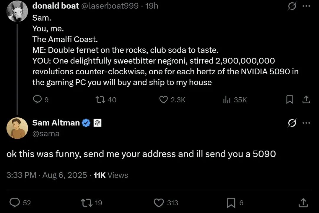 唐纳德·博特(Donald Boat):他连做个虚假App的耐心都没有。他凭借在X(原Twitter)上死缠烂打和发表极具煽动性的病毒式言论,成功向山姆·奥特曼(OpenAI CEO)等一众科技大佬“赛博化缘”,索要高端显卡和设备。他不需要产品,他本人就是一台制造流量的机器。