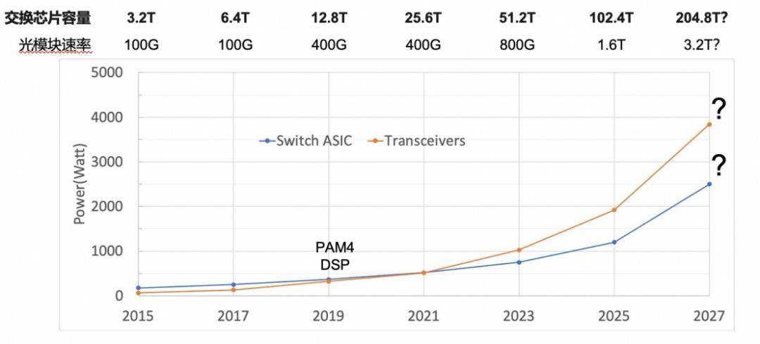 2019年12.8T交换芯片首次使用50Gbps PAM4调制格式的Serdes,彼时DSP芯片开始在光模块中使用,光模块的功耗开始赶上交换芯片的功耗,未来1.6T/3.2T网络,光的功耗将超过电的功耗2倍以上,功耗问题成为网络带宽提升最大的挑战之一。