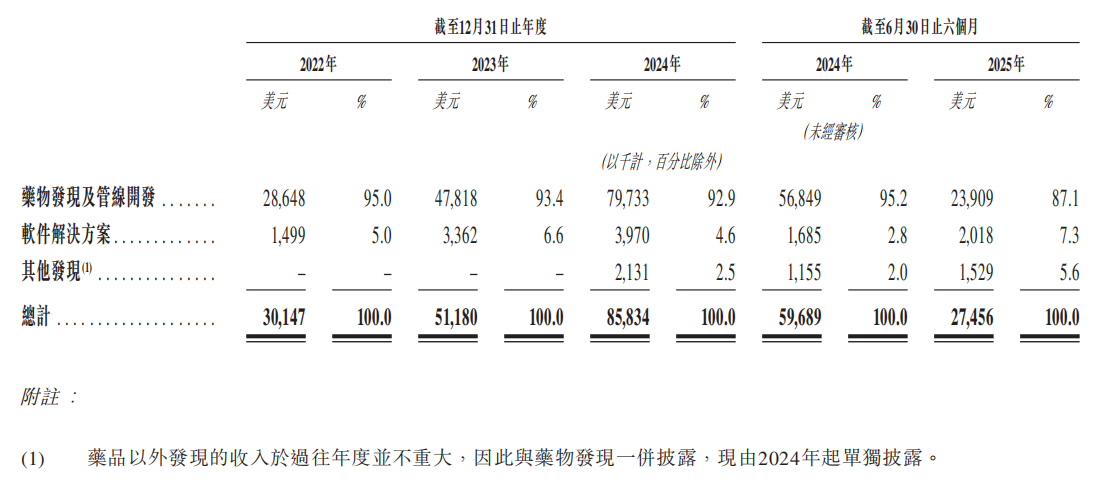 英矽智能成立于2014年,AI赋能的药物发现及管线开发收入贡献保持在87%以上,是业绩的核心驱动力。