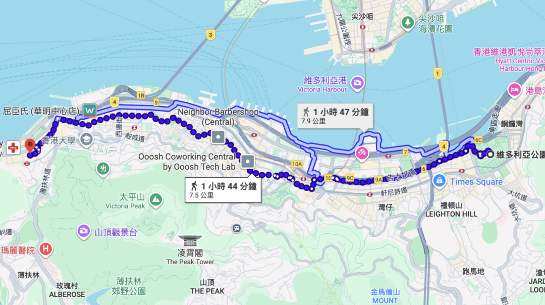 从铜锣湾维多利亚公园走回坚尼地城的路线