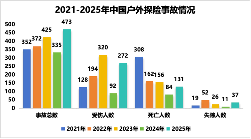 《2025年度中国户外探险事故报告》内容显示,2025年共发生户外探险事故473起,同比增长41.2%,其中受伤272人、死亡131人、失踪37人。与2024年相比,2025年事故总数增加138起,上升41.2%;受伤人数增加180人,上升195.6%;死亡人数增加47人,上升56.0%;失踪人数增加26人,上升236.4%。