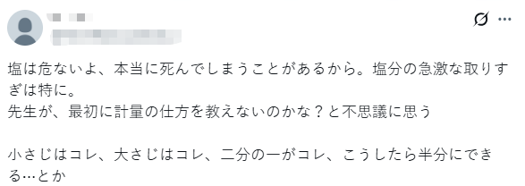 当然,一般人不可能会空口吃那么多盐,不过厨艺课的情况就不太一样。由于盐被揉进了面团里,所以学生们可能没办法在吃的时候立刻察觉并吐出来,便不知不觉中摄入了过量的食盐。