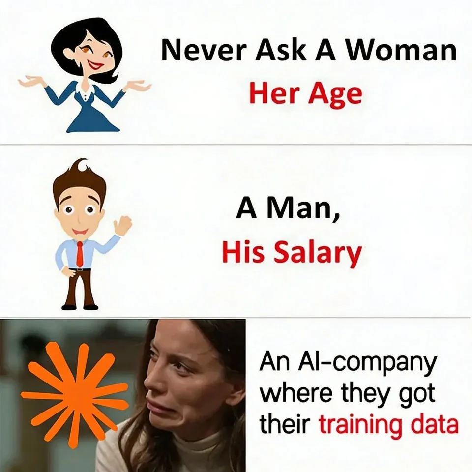 和马斯克一样,一位用户在评论区中贴了一张梗图,将“问女性年龄”,“问男性薪资”,“问AI公司的训练数据从哪里来”列为不礼貌的行为,暗示大模型训练数据来源之谜。