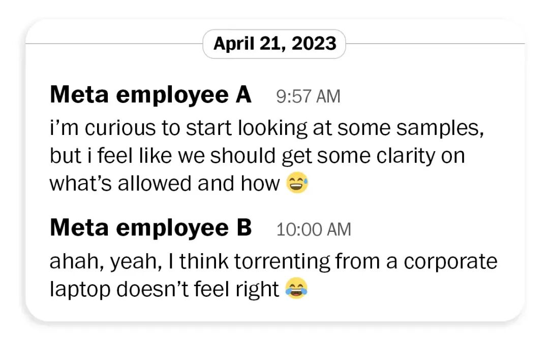 针对Meta的诉讼文件显示,有员工在2023年直接写道:「用公司笔记本进行种子下载感觉不太对劲。」他后来还专门向法务团队反映,称使用种子网站可能意味着向他人分发盗版作品,「这在法律上可能行不通。」