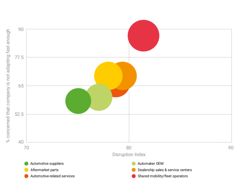 共享出行/车队运营商(Shared mobility/fleet operators)成为最焦虑且受颠覆最严重的群体。他们的颠覆指数约为85,几乎所有的高管都担忧公司跟不上变化。
