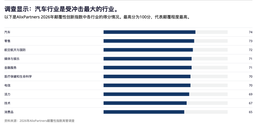这项覆盖11个国家及10个行业、逾3000名企业高管的深度调查数据显示,汽车行业连续第二年成为全球受冲击最大行业,其颠覆性指数为74分。