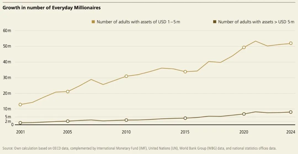 瑞银发布的《2025全球财富报告》给了我们一组更直观的数据,2024年全球资产在100万美元以上的百万富豪总人数接近6000万,这些人合计掌握了约226万亿美元资产,占到了全球个人财富近一半。