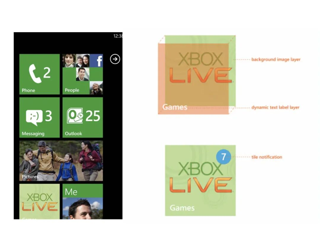 Microsoft Design Language理念的第一次完整落地,则是在Windows Phone 7/8上。当年的Windows Phone主屏幕上,陈列的并不是一排排静态图标,而是一块块实时发生变化的用户信息切片。