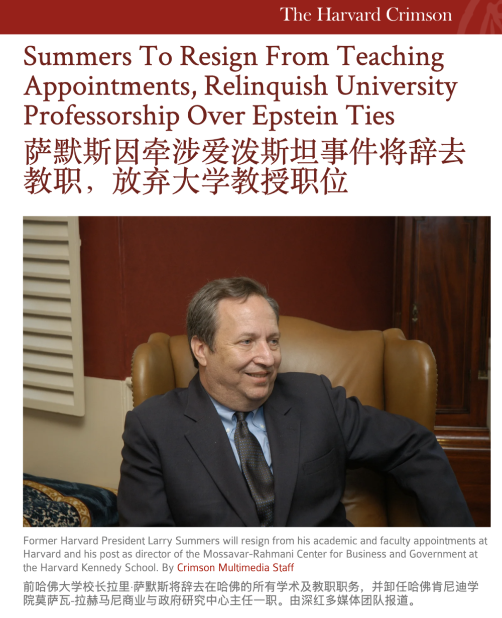 第二日,哈佛大学发言人向多家媒体证实,此前与爱泼斯坦邮件往来曝光而名声狼藉的哈佛前校长、著名经济学家拉里·萨默斯(Larry Summers)也将辞去他在哈佛全部研究及教学职位。