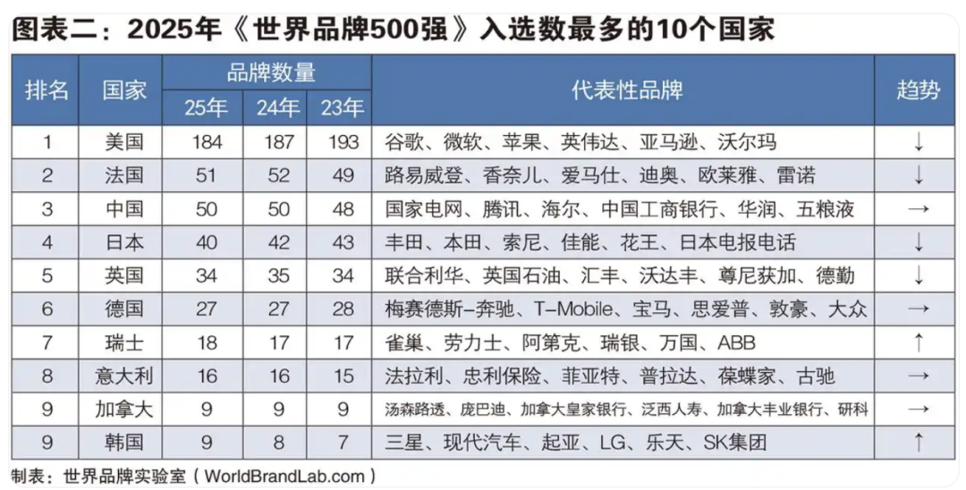 世界500强品牌的国家分布确实与国家实力高度相关,2025年,美国有184个品牌入选,中国第三有50个。而在三年前的2022年,中国还排在第四。回望改革开放初期,世界品牌500强榜上压根不见中国品牌。