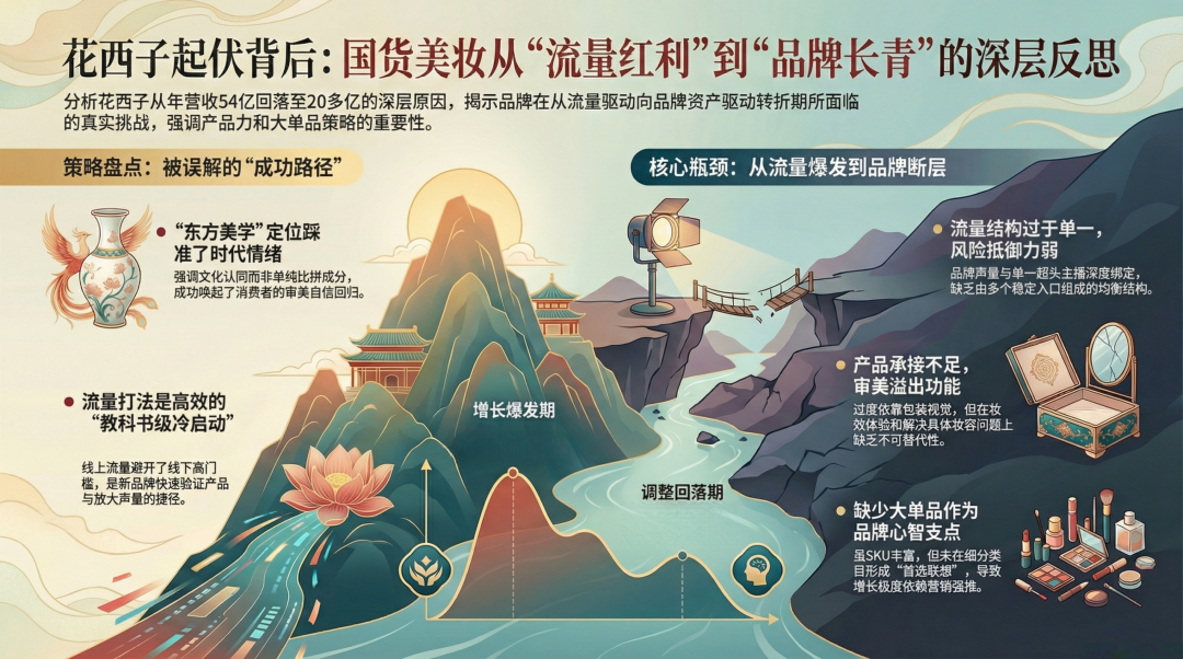 关于花西子,如果只归因于“流量失效”或“定位失误”,其实都不够准确。今天,旁光就带大家来深入盘一盘。