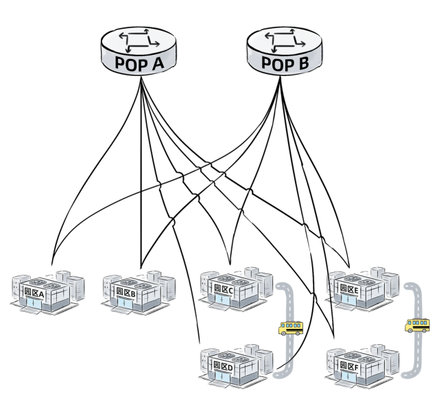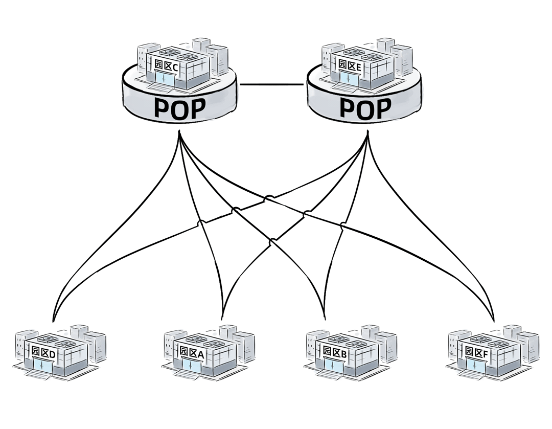 所有园区都需要和2个POP点机房互联,同时可以保留园区之间的直联,园区直联通常在这种架构中叫“直通车”。