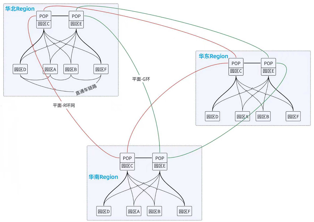 在这个基础上,每个Region内园区除了和POP互联外,还可以按需组建直通车链路: