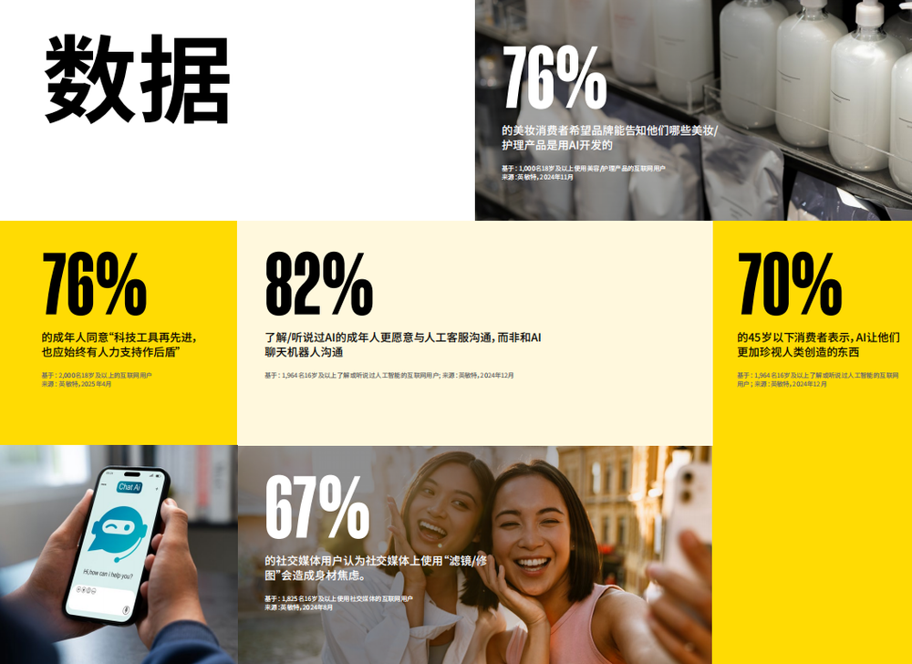 从原料研发到产品交付,从内容创作到用户体验,AI以效率为核心,完成了对美妆产业链的全维度赋能,成为当下美妆行业不可缺少的技术工具。但与此同时,英敏特(MINTEL)报告显示,76%的成年人认为“科技工具再先进,也应始终有人力支持作后盾”,为这场AI狂欢埋下了人本反思的伏笔。