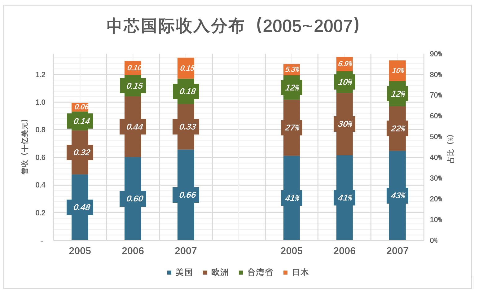 2007年,来自美、欧、台、日的收入分别占营收的43%、22%、12%,10%,合计86.8%;