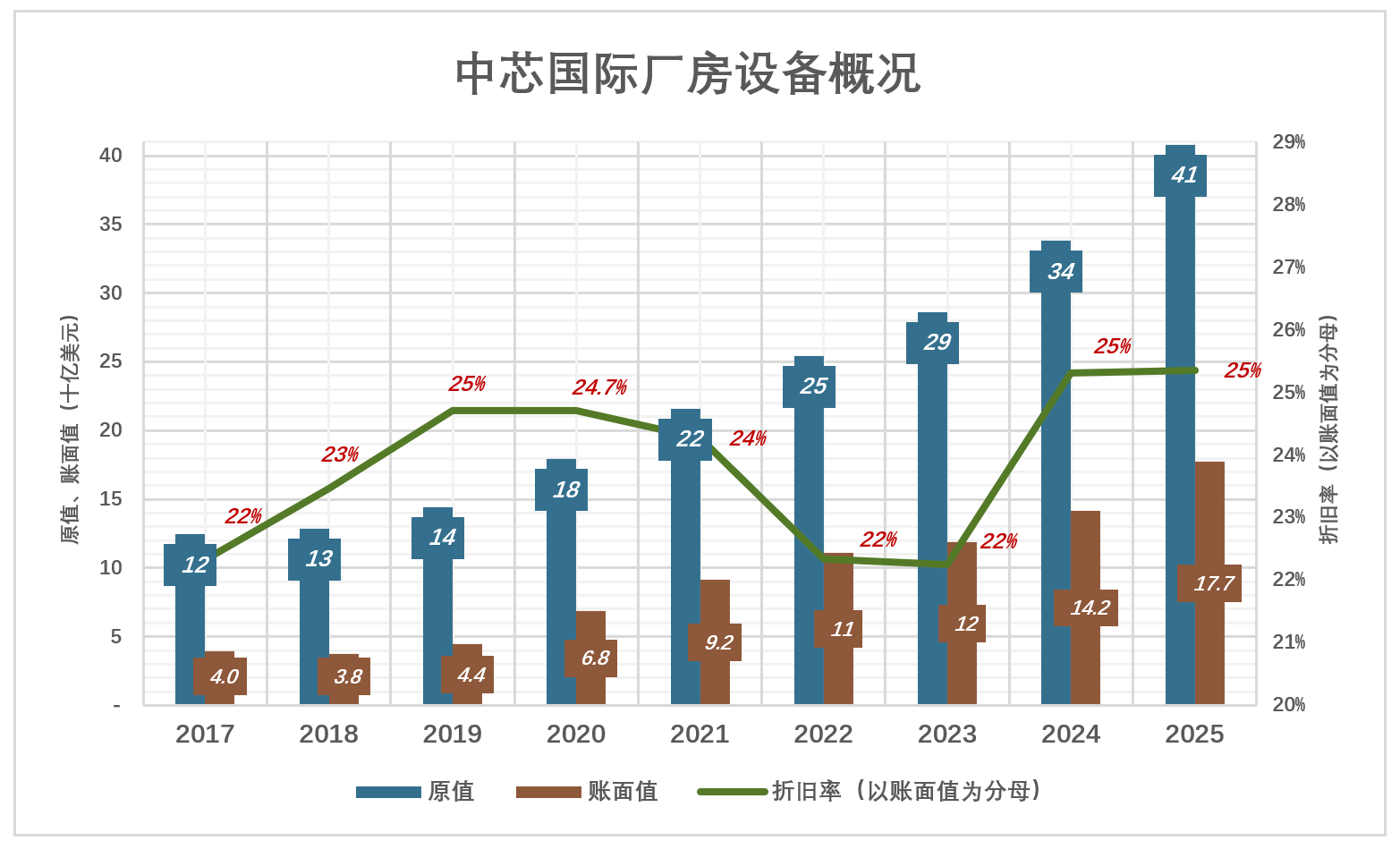 2025年末,机器设备原值、账面值分别为408.1亿美元、177.2亿美元。